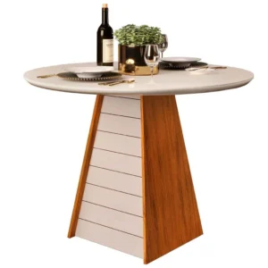 uma base de metal cilíndrico dourado, transmitindo leveza e modernidade. Além de seu visual refinado, a estrutura